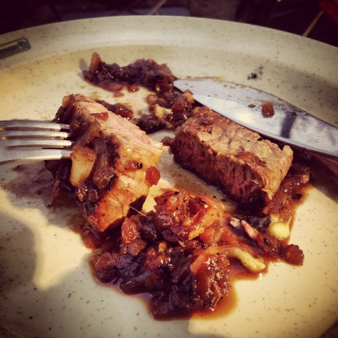 ステーキソースを現地で作りステーキを焼いて食べる技術。
